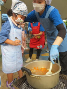 外ではカレーのルーを入れて煮こむ様子を見学しました。