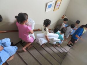 毎週木曜日のお昼寝の後は、ぺんぎん組のお布団を運ぶお手伝いをしています。