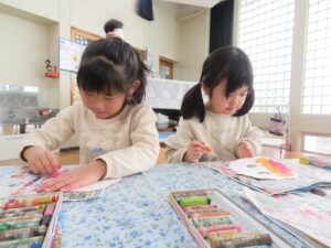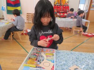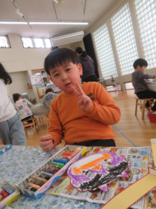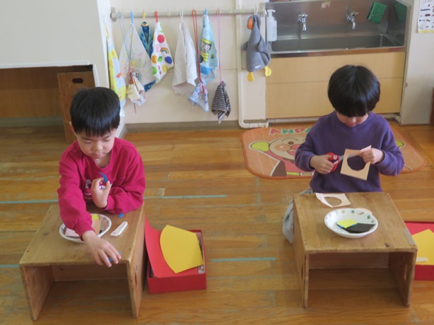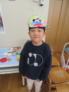 大きいかもめ組は節分の時に使う、鬼のお面を作りました!自分たちで色を考え、丁寧に塗り、お花紙を頭の部分に貼りました。