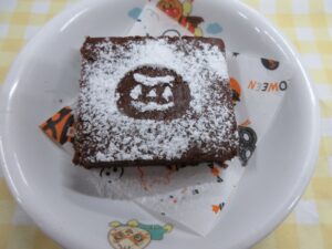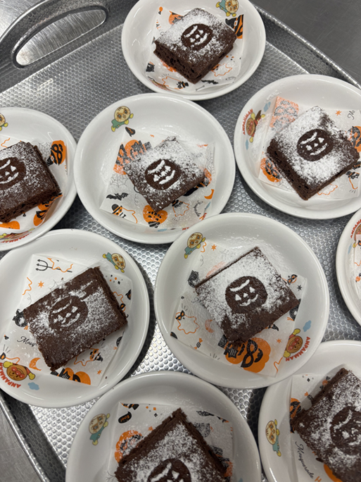 10月31日(金)はハロウィンです! 調理室から子どもたちに、かぼちゃの絵を浮き上がらせたブラウニーをプレゼント! ブラウニーの下にはハロウィン仕様のクッキングシートを敷き可愛くしました。