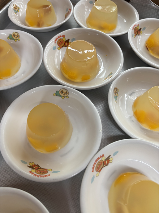 フルーツゼリーはサイコロ上にし甘く炊いたものをみかん缶や黄桃缶と一緒にゼリーの中に入れました。