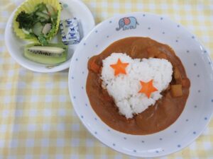 11月の誕生日会を行いました。 メニューは子どもたちが大好きなカレーです! 誕生日会なのでご飯をハート型、人参を星形にしました♪ 子どもたちも「ご飯がハートだ!」「お星さまがあるよ!」と、とても喜んでくれました。