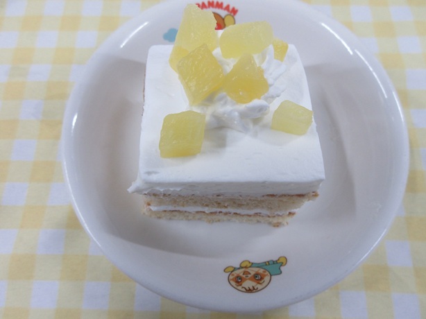 おやつの飾りケーキの果物はパインです! パインを小さくカットし散りばめ、イルミネーションをイメージしました♪