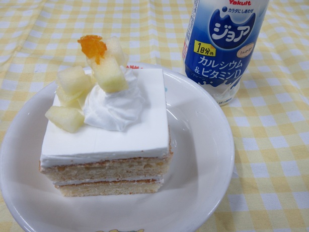 おやつの飾りケーキは、2~5歳はりんごと保育園で採れたきんかん、