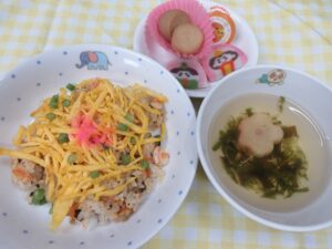 給食ではひなまつりの定番のちらし寿司を食べました!